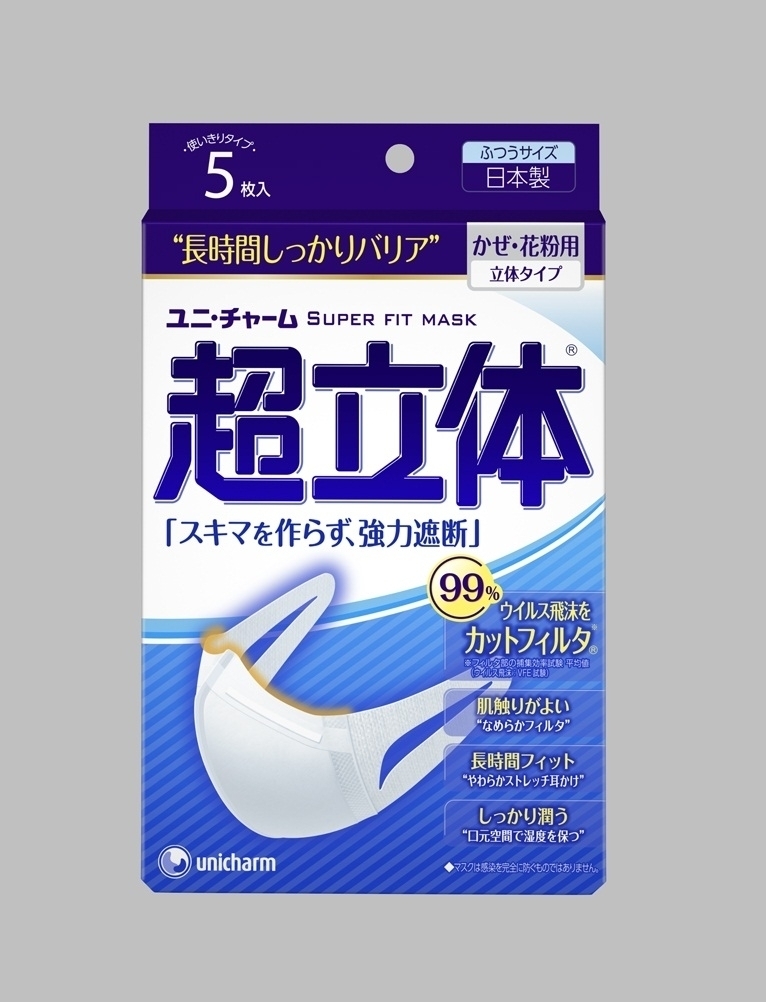 『超立体マスク』はノーズフィット搭載で鼻・ほほ・あごにスキマを作らず、カップ部の「超立体構造」と、「三層構造」の高密度フィルタ搭載でウイルス飛沫や花粉をしっかりブロックします。