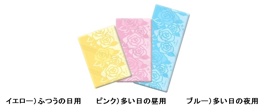 イエロー:ふつうの日用/ピンク:多い日の昼用/ブルー:多い日の夜用