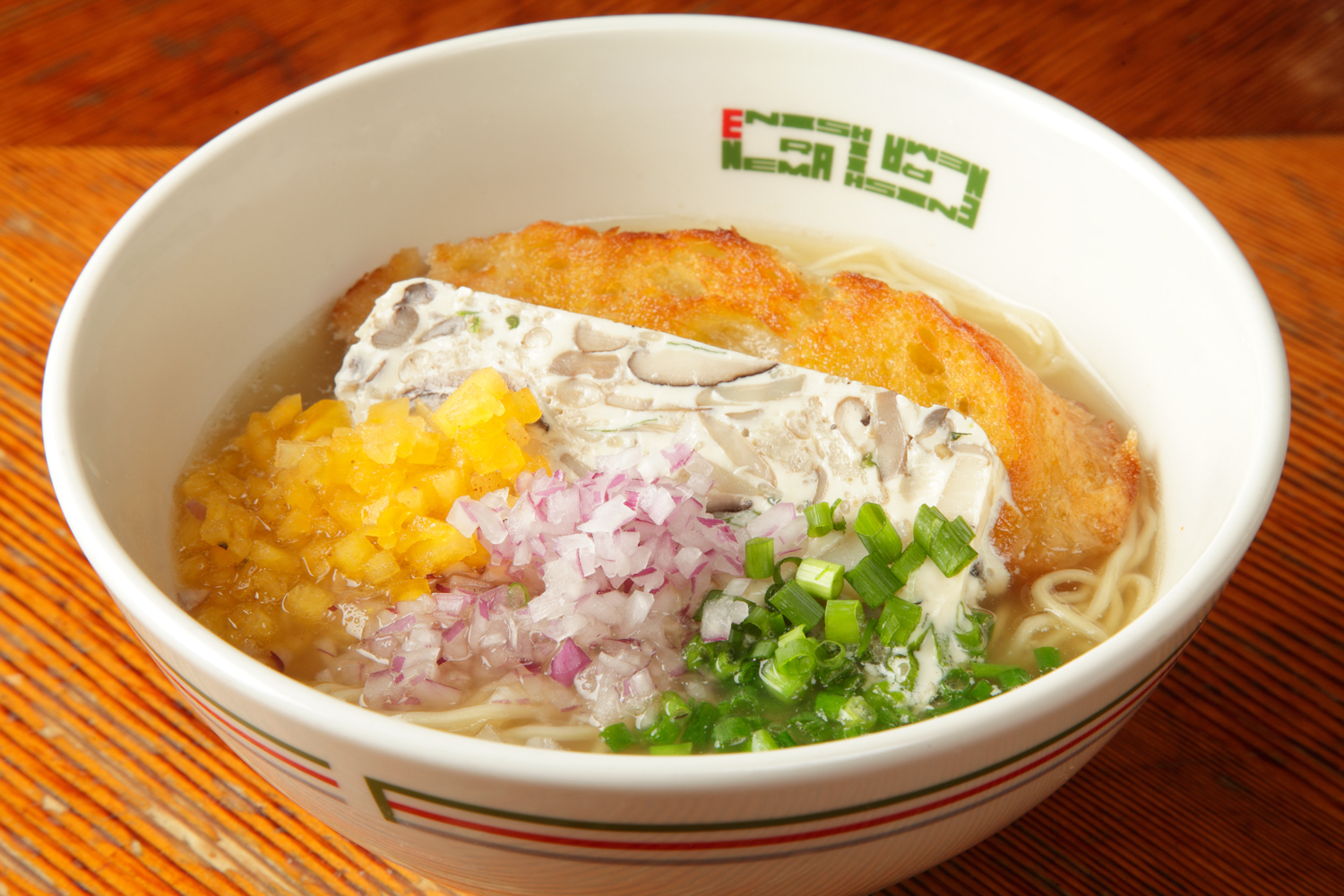 プレミアム豆乳クリーム、きのこ、ホタテなどでつくったテリーヌをトッピング。徐々に和風スープと溶け合い、濃厚な豆乳のコク、旨みをしっかり感じられる、味の変化が楽しめる一杯。