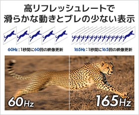 リフレッシュレート165Hz駆動に対応した 16:10の比率となるWUXGA(1920×1200)解像度の液晶モニタは、一般的な60Hz駆動の液晶モニタと比べ、より滑らかで鮮明な映像を映し出します。動きの激しいシーンでもブレが少なく、動画鑑賞や映像編集など、細かな動きの確認が求められる作業においても、高い視認性と快適な作業環境を提供します。