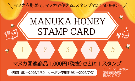 内容:ミールミィ各店(三条本店・京都?島屋店・阪急うめだ店)では、マヌカハニーをご購入いただくとスタンプが貯まる「スタンプカード」をキャンペーン期間中に配布します。マヌカアイテム1,000円(税抜)につき1スタンプを押印し、5個貯まると店頭で使える500円OFFクーポンとしてご利用可能です。