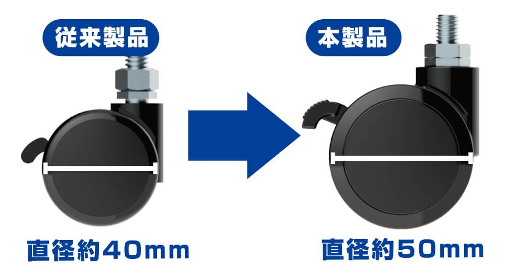 本製品のキャスターは従来製品よりも、回転効率が上がり軽い力で動かせます。