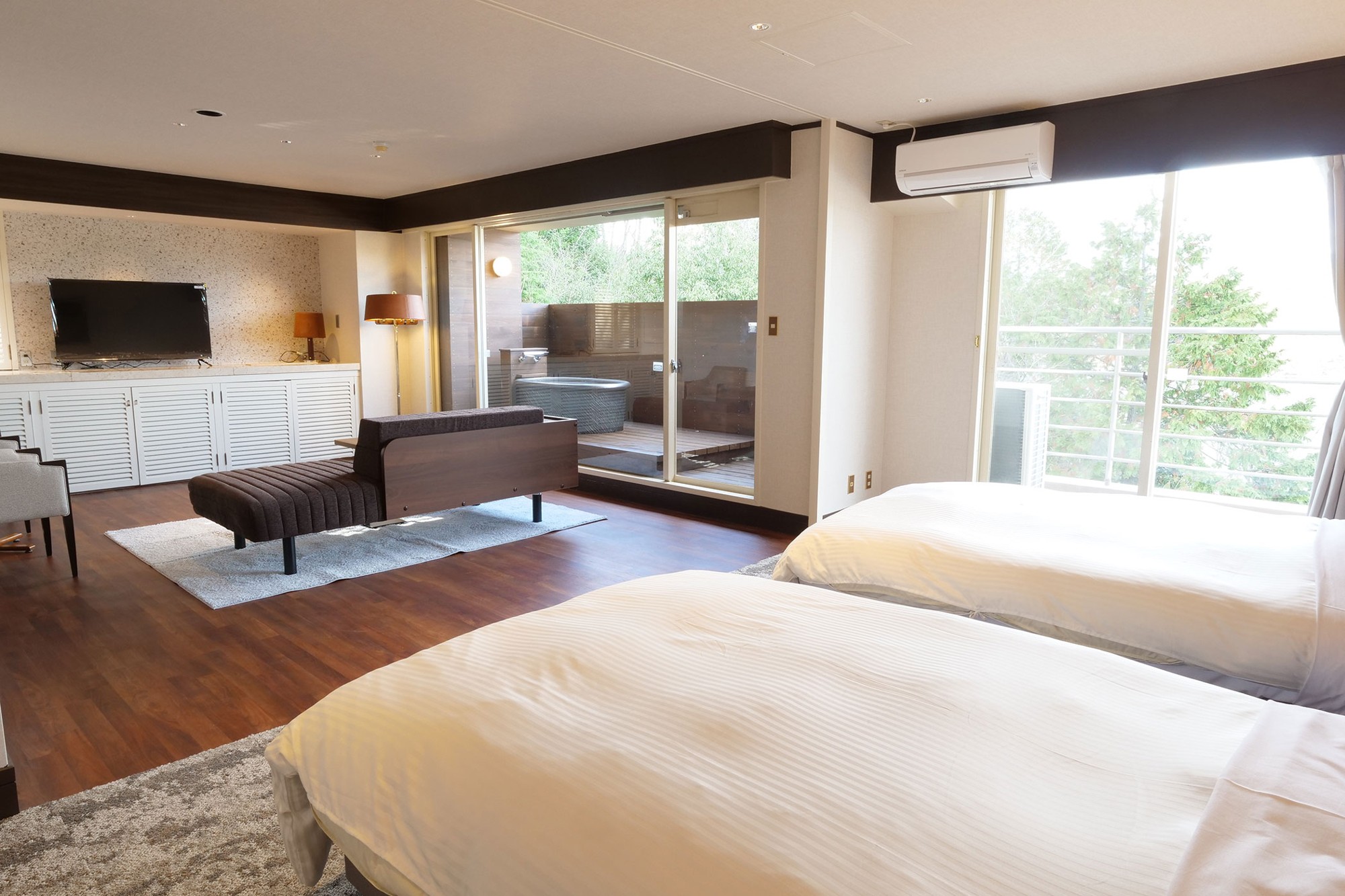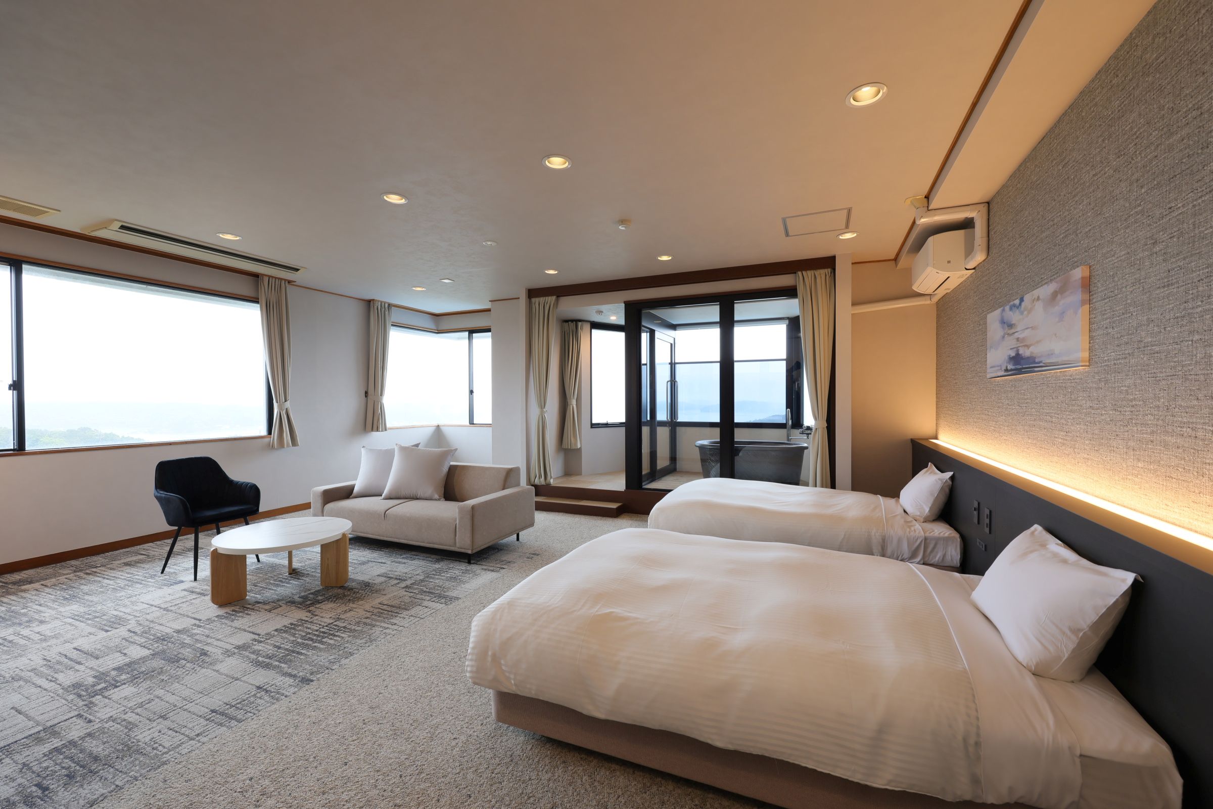 客室の一部を露天風呂付客室へ変更いたしました。お部屋でも開放感を味わえる入浴をお楽しみください。また、ベッドタイプの客室も追加しております。お子様連れにうれしいキッズスペース付客室も新たに登場いたします。気軽にキャンプ泊が楽しめるグランピングエリアルームもあり、多彩な客室からご利用シーンに合わせお選びいただけます。