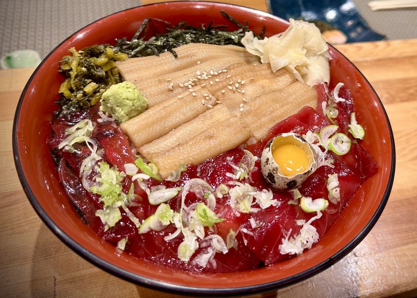 思い出深いのは、両親を連れて行き、初任給でご馳走したことです。私が就職した年にオープンしたので、一緒にキャリアを重ねている感覚で、毎年、大将の握りをほおばりながら「あれから〇年か〜」と思い出に花を咲かせています。ランチで一番人気の「づけ穴ちらし」は、高級感のある丼ぶりの蓋を開けると、大ぶりだけれどふわふわで柔らかい”煮あなご”とうずらの黄身の乗った味わいの深い”漬けマグロ”がで迎えてくれます。シャリの中をほぐすと、たこ、えび、とびっこ、たまごなど、大将がこだわり抜いたネタたちが隠れており、ひとつひとつ味わいながら食べるこのちらしがたまりません。安心してください。