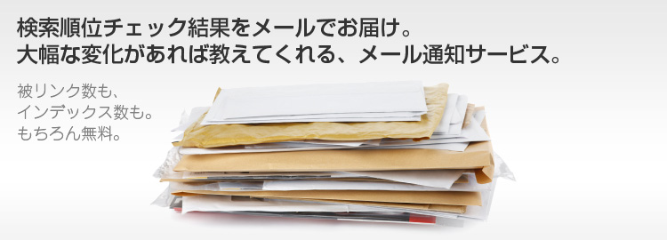 メールレポートは、あなたのサイトの検索順位・インデックス数・被リンク数を自動で取得し、定期的にメールで通知するサービスです。