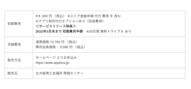 北大阪商工会議所 情報センター(大阪府交野市私部西2-16-1)は、プログラミング不要の低コスト自社アプリ制作ツール「Applicia(アプリシア)」を、地域の小規模事業者や各種団体を中心に、全国的に販売を開始しました。