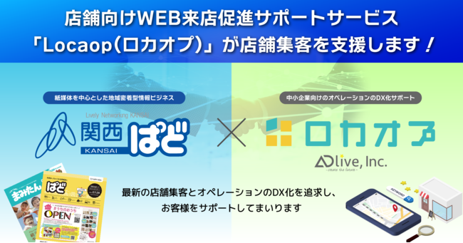 株式会社関西ぱど(本社:大阪市西区靭本町1-10-24 三共本町ビル5F 代表取締役 北田 淳一)は、2022年4月1日に、店舗向けWEB来店促進サポートサービス「Locaop(ロカオプ)」を展開するADlive株式会社と資本業務提携を締結いたしました。
