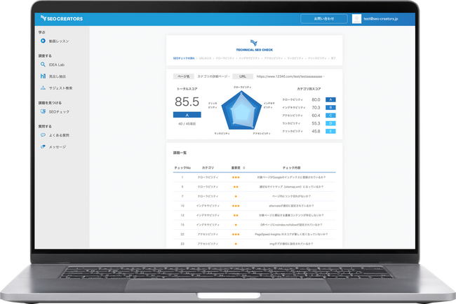 SEOクリエイターズは、SEOが学べる、調査できる、質問できる、インハウスSEOのための総合支援ツールです。動画でSEOが学習できたり、テクニカルSEOを簡単にチェックして課題をグラフ化することもできます。また、ツールの機能としてAIを利用した「IDEA Lab」や「AIアシスタント機能」も搭載。