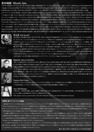 新作初演には日本、インドネシア、台湾で活躍する三名の若手作曲家、佐原詩音、Septian Dwi Cahyo、Yun-Chih Huangによる作品が上演されます。いずれも會田瑞樹のための献呈作品であり、まさにそれぞれの作曲家の持つ文化背景が出会う様相が音楽で示され、その豊かで繊細な打楽器音楽の世界に大きな期待が寄せられます。