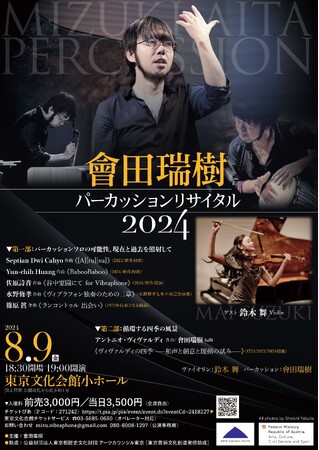 打楽器奏者、作曲家として国内外での活躍を続ける會田瑞樹は、2024年8月9日、東京文化会館小ホールにおいて「パーカッションリサイタル2024」を開催いたします。本公演は、公益財団法人東京都歴史文化財団 アーツカウンシル東京 [東京芸術文化創造発信助成]の助成採択を受け実現した企画であり、メインプログラムは、欧州で長く活躍を続けるヴァイオリニスト鈴木舞氏を迎え、アントニオ・ヴィヴァルディ作曲/會田瑞樹編曲《ヴィヴァルディの四季 -和声と創意と躍動の試み-》初披露。世界的作曲家篠原眞氏(1931-2024)が遺した幻の打楽器独奏曲《ランコントル 出会い》日本初演。日本、インドネシア、台湾で活躍する三名の若手作曲家、佐原詩音、Septian Dwi Cahyo、Yun-Chih Huangによる作品が上演されます。