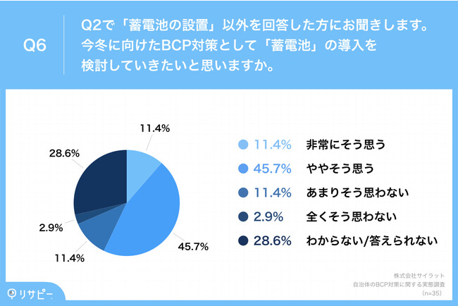 Q2で「蓄電池の設置」以外を回答した方に、「Q6.今冬に向けたBCP対策として「蓄電池」の導入を検討していきたいと思いますか。」(n=35)と質問したところ、「非常にそう思う」が11.4%、「ややそう思う」が45.7%という回答となりました。