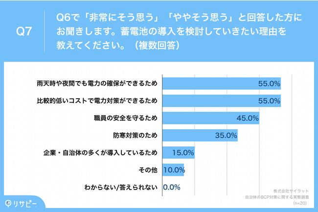 Q6で「非常にそう思う」「ややそう思う」と回答した方に、「Q7.蓄電池の導入を検討していきたい理由を教えてください。(複数回答)」(n=20)と質問したところ、「雨天時や夜間でも電力の確保ができるため」が55.0%、「比較的低いコストで電力対策ができるため」が55.0%、「職員の安全を守るため」が45.0%という回答となりました。