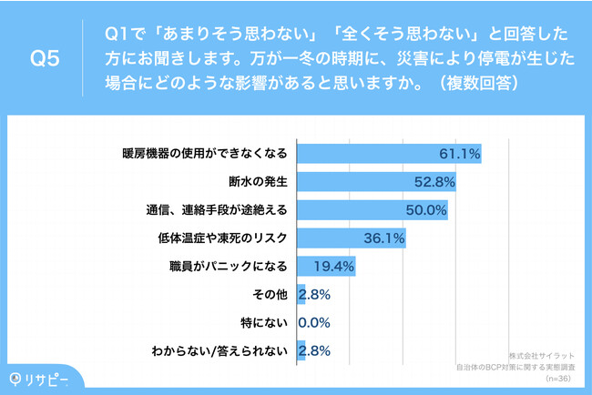 Q1で「あまりそう思わない」「全くそう思わない」と回答した方に、「Q5.万が一冬の時期に、災害により停電が生じた場合にどのような影響があると思いますか。(複数回答)」(n=36)と質問したところ、「暖房機器の使用ができなくなる」が61.1%、「断水の発生」が52.8%、「通信、連絡手段が途絶える」が50.0%という回答となりました。