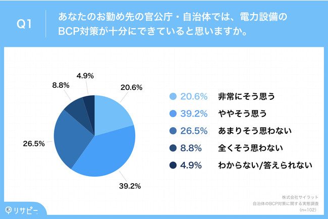 「Q1.あなたのお勤め先の官公庁・自治体では、電力設備のBCP対策が十分にできていると思いますか。」(n=102)と質問したところ、「あまりそう思わない」が26.5%、「全くそう思わない」が8.8%という回答となりました。