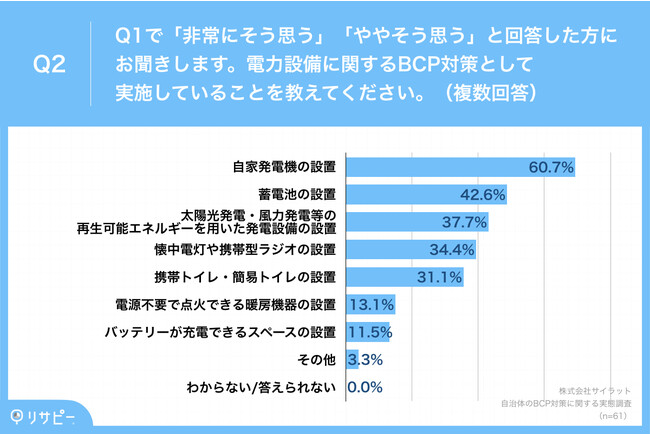 Q1で「非常にそう思う」「ややそう思う」と回答した方に、「Q2.電力設備に関するBCP対策として実施していることを教えてください。(複数回答)」(n=61)と質問したところ、「自家発電機の設置」が60.7%、「蓄電池の設置」が42.6%、「太陽光発電・風力発電等の再生可能エネルギーを用いた発電設備の設置」が37.7%という回答となりました。
