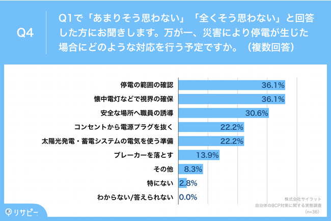 Q1で「あまりそう思わない」「全くそう思わない」と回答した方に、「Q4.万が一、災害により停電が生じた場合にどのような対応を行う予定ですか。(複数回答)」(n=36)と質問したところ、「停電の範囲の確認」が36.1%、「懐中電灯などで視界の確保」が36.1%、「安全な場所へ職員の誘導」が30.6%という回答となりました。