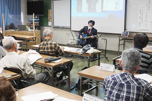講義の中では、ジャズギターの生演奏も披露し、「生の音楽」に触れる機会も設けました。