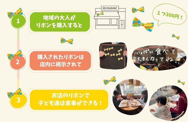フードリボンプロジェクトに参加登録した飲食店では、1つ300円*でオリジナルのリボンが販売されます。お店のお客様によってリボンが購入されると、そのリボンは店内のボードに掲示されていき、子ども達はそれらのリボンを使用することで、一食分の食事と交換ができる仕組みです。(*フードリボンの金額は社会情勢によって変動する場合があります)
