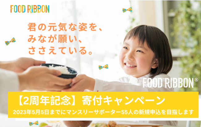 2023年5月6日をもって設立2周年を迎える一般社団法人ロングスプーン協会(代表:橋本展行 千葉県市川市塩焼4-10-3-711)は、飲食店による新しい子ども食堂の形として「フードリボンプロジェクト」を全国に推進しています。この度は活動のさらなる発展に向けて、5月5日「こどもの日」を最終日とする2周年記念寄付キャンペーンを実施いたします。毎月1,000円から定額寄付をするマンスリーサポーター55名の新規申し込みを目指します。
