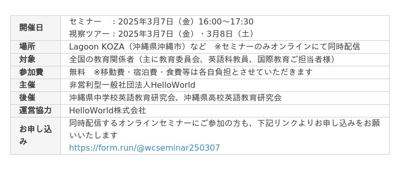 非営利型一般社団法人HelloWorld(所在地:沖縄県沖縄市、代表理事:野中 光・冨田 啓輔)は、「働き方改革 × 国際交流」をテーマに、デジタルツールを活用した新しい教育を企画・実践している有識者や教育関係者が登壇する事例紹介セミナーを、沖縄会場およびオンライン(Zoom)で開催いたします。
