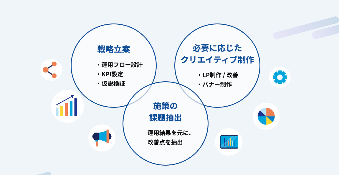 - 広告運用の最適化:運用を元に課題を抽出、迅速なPDCAサイクルによる成果改善