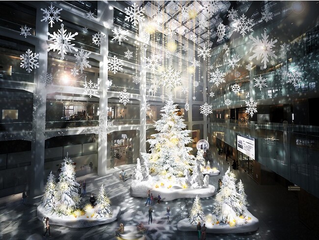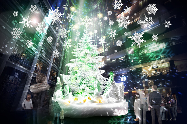 さらに、期間中は「森のオーケストラ」を表現したクリスマスショーを毎日実施。オーケストラ調にアレンジされたクリスマスの名曲に加え、今回特別に制作したオリジナル楽曲とともに、アトリウム全体が白い森の繊細な姿から一気に表情を変え、7色に光り輝きます。温かい灯りのなかにも、自然の力強さを感じさせる、心温まるハートフルなショーで皆様を魅了します。