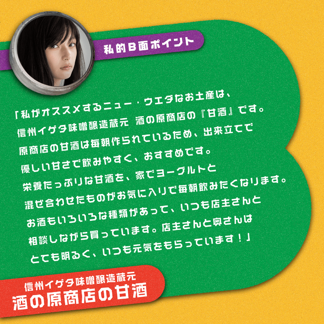 「私がオススメするニュー・ウエダなお土産は、信州イゲタ味噌醸造蔵元 酒の原商店の『甘酒』です。原商店の甘酒は毎朝作られているため、出来立てで優しい甘さで飲みやすく、おすすめです。栄養たっぷりな甘酒を、家でヨーグルトと混ぜ合わせたものがお気に入りで毎朝飲みたくなります。お酒もいろいろな種類があって、いつも店主さんと相談しながら買っています。店主さんと奥さんはとても明るく、いつも元気をもらっています!」