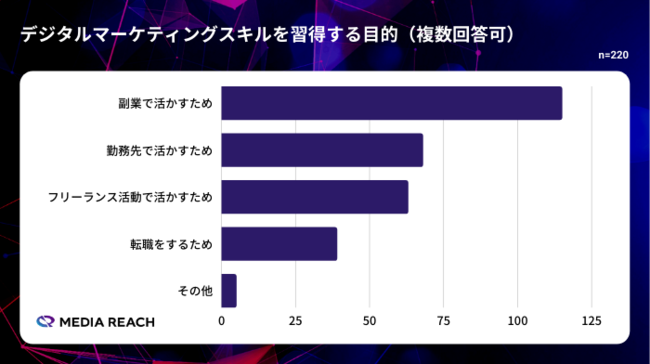 デジタルマーケティングスキルを習得する目的は「副業で活かすため」が最も多く、次いで「勤務先で活かすため」が多かった