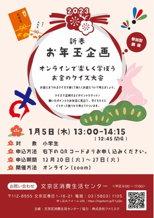【文京区主催・ファミスク協力】1月5日(木)に、新春お年玉企画 オンラインで楽しく学ぼうお金のクイズ大会を開催!