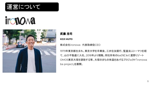 1947年設立。「大塚のまちの体温をあげる」をコンセプトに、大塚のまちの活性化プロジェクト「ironowa ba project」を展開。2018年5月に竣工したビル「ba01」にOMO5東京大塚by星野リゾートを誘致。