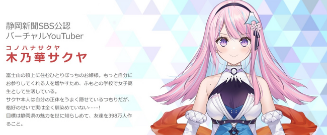 当社は各社公認バーチャルYouTuber(以下、VTuberという)事業へ参入し、既に活躍中の静岡新聞社・静岡放送 公認VTuber「木乃華サクヤ」および、デビューに向け準備中のUTYテレビ山梨の公認VTuberと共に、BtoB専門のVTuber事務所としての地位を強化します。