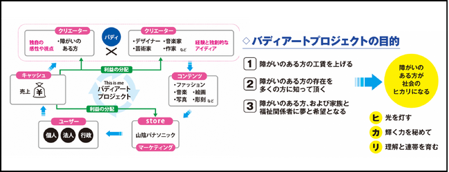 障がいのある方の独自の感性や視点・想像力と、クリエイターの経験と独創的なアイデアを活かし、世界中の人々が求めるコンテンツを創造することで持続可能なビジネスモデルを構築します。また多様性や包括性を促進することで誰もが豊かな人生を送ることが出来るサスティナブルな社会を目指すプロジェクトです。構想から4年、2022年8月より下記図の目的とスキームの下、山陰パナソニック株式会社が事務局として始めました。