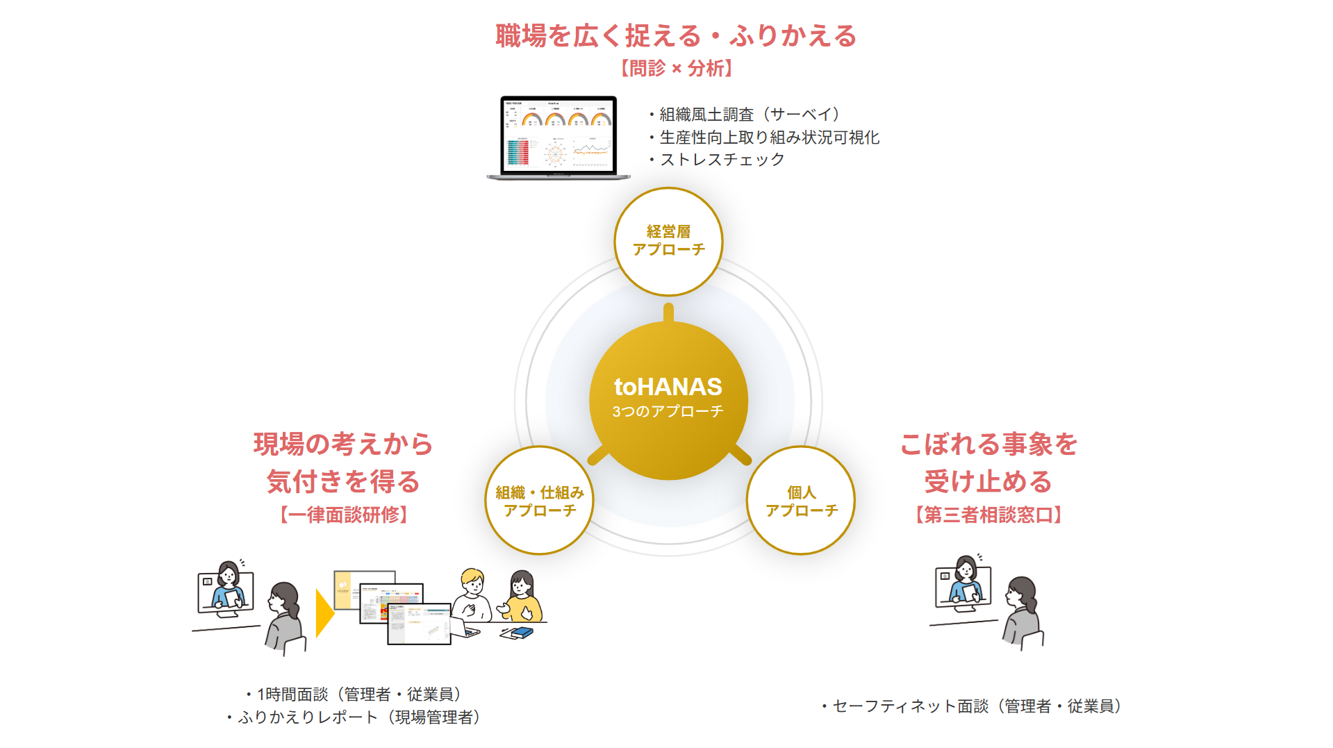toHANASは、面談・サーベイ・改善施策を一体化し、職場環境の把握から改善・定着までを一気通貫で支援する業界初のプラットフォームです。