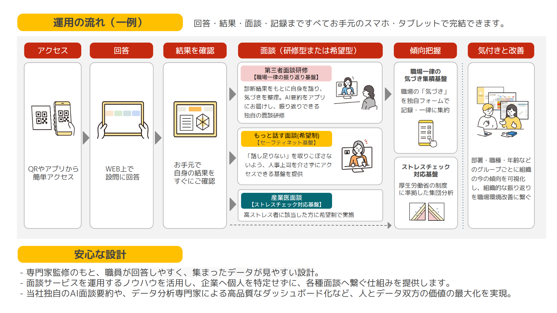 国家資格キャリアコンサルタントによる定期面談と匿名アンケートを通じて現場の声を収集し、クラウド上でデータを集約・可視化・分析。経営層が課題を把握し、改善策を意思決定できる仕組みを提供します。また、改善施策の実行と定着を専門家が伴走し、「データ × 伴走」による職場環境改善PDCAを業界で初めて実現しました。単なるサーベイやメンタルケアにとどまらず、「現場データが経営判断や組織運営に還元される」ことが特徴です。