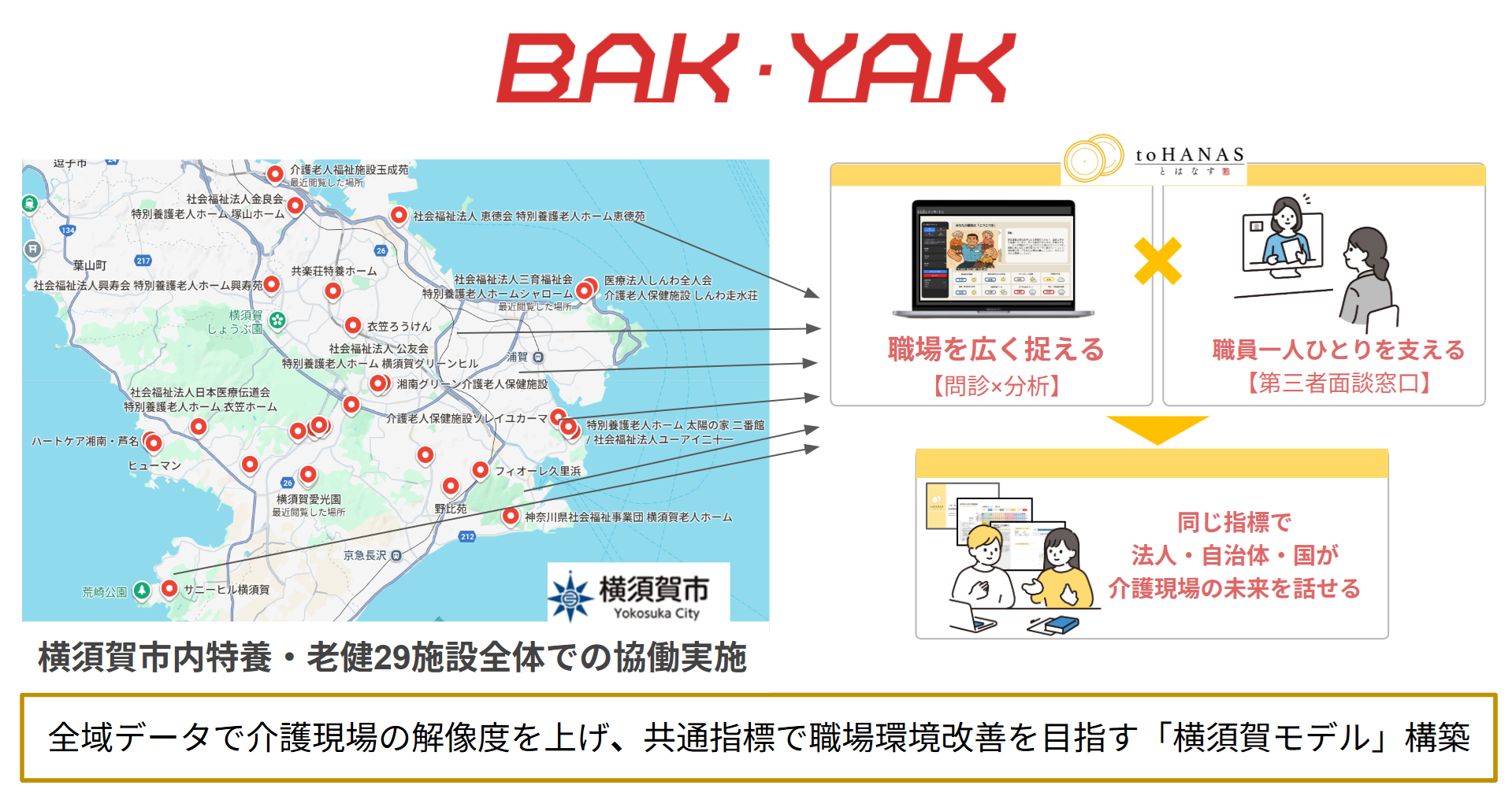 toHANASは、リリース後約1年で全国100以上の介護施設と3つの医療法人が導入し、累計3,000件以上の面談を実施しています。導入施設では退職者数の大幅削減や早期離職率の半減、医療介護現場で働くことに対する前向き度の向上といった成果が報告されています。また、toHANASは、神奈川県・横須賀市など複数の自治体・医療介護事業者と連携し、職場環境データを基盤とした地域協働運営モデルの社会実装を進めており、自治体や国とデータを共有し、地域全体の働きやすさ向上と人材定着を支援する新しい枠組みの構築を推進しています。