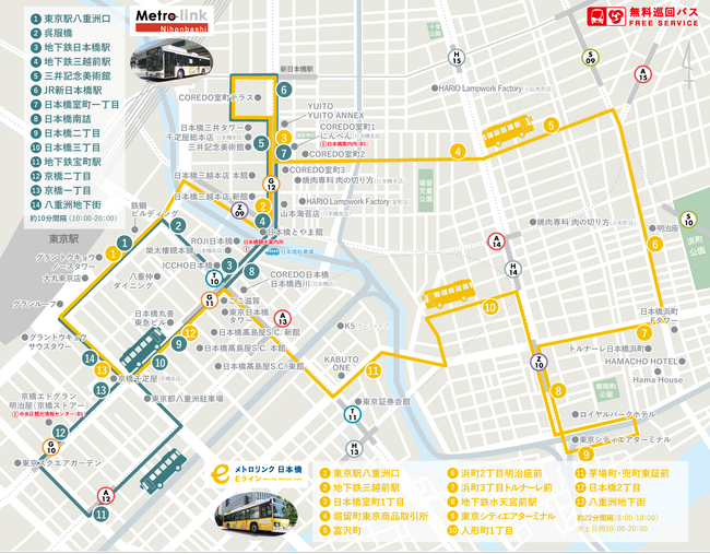 ?メトロリンク日本橋Eライン…東京駅八重洲口から浜町・人形町・兜町エリアまでを結び、平日午前8時から午後6時、土日祝日は午前10時から午後8時まで約22分間隔で運行しています。
