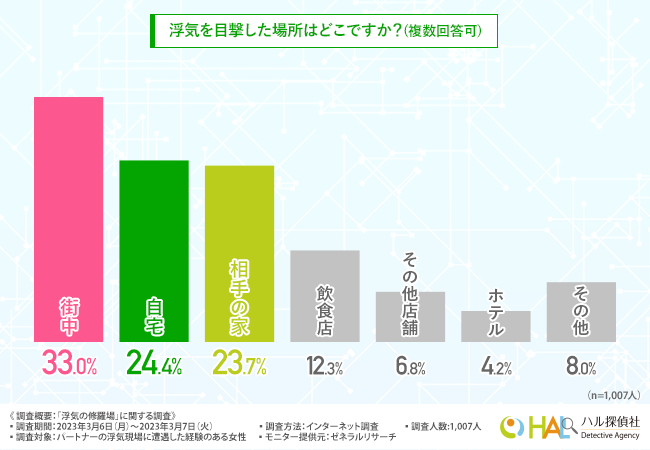 「浮気を目撃した場所はどこですか?(複数回答可)」と質問したところ、『街中(33.0%)』と回答した方が最も多く、次いで『自宅(24.4%)』『相手の家(23.7%)』『飲食店(12.3%)』『その他店舗(6.8%)』と続きました。
