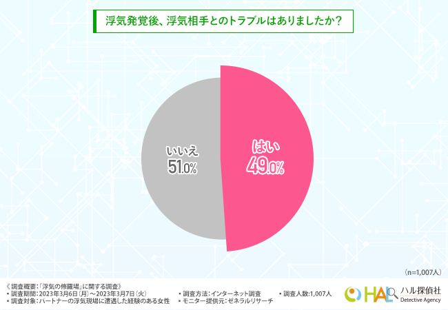 「浮気発覚後、浮気相手とのトラブルはありましたか?」と質問したところ、約半数の方が『はい(49.0%)』と回答しました。