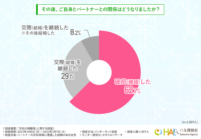 「その後、ご自身とパートナーとの関係はどうなりましたか?」と質問したところ、『破局(離婚)した(62.7%)』という回答が最も多く、次いで『交際(結婚)を継続した(29.1%)』『交際を継続した ※その後結婚した(8.2%)』という回答に続きました。