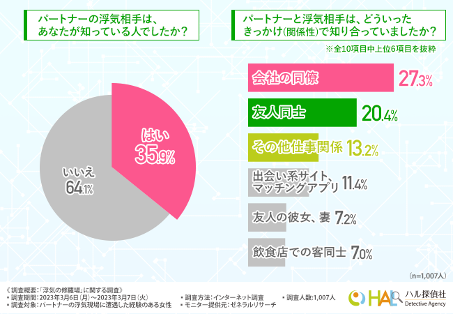 「パートナーの浮気相手は、あなたが知っている人でしたか?」と質問したところ、3割以上の方が『はい(35.9%)』と回答しました。
