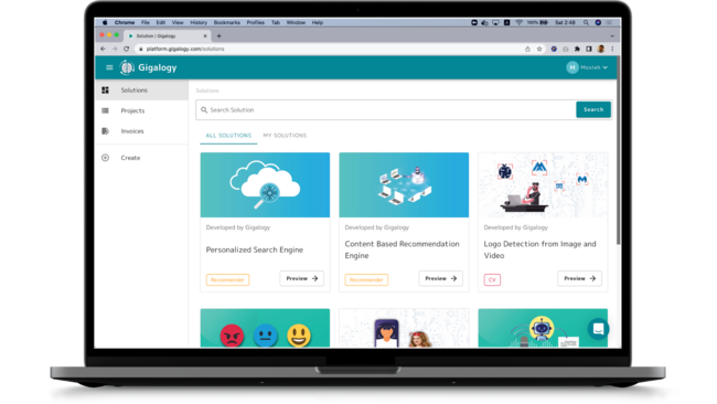 GAIPにおいて、ユーザーは必要とするソリューションを検索し、その詳細を確認し、プロジェクトを作成します。その後、シンプルなAPIやSDK連携だけであらゆるデジタルプロダクトにAIソリューションの統合ができます。