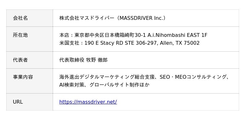マスドライバー(https://massdriver.net/)は、日本企業の米国事業進出に長けたデジタルマーケティング企業です。