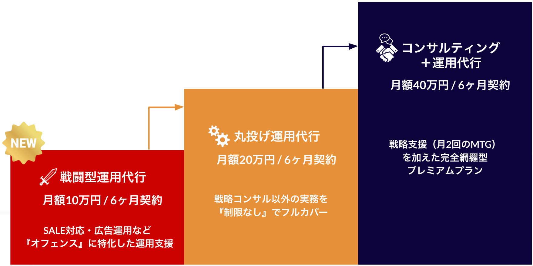 こうした声に応えるため、CARDSはオフェンス領域の実行支援に特化した新プランを開発しました。既存の「丸投げ運用代行」「コンサルティング+運用代行」と合わせ、事業者のニーズや予算に応じた3段階のプラン体系を整備しました。