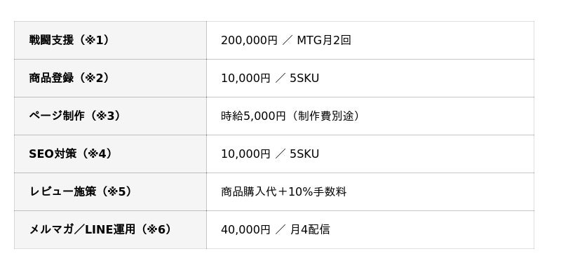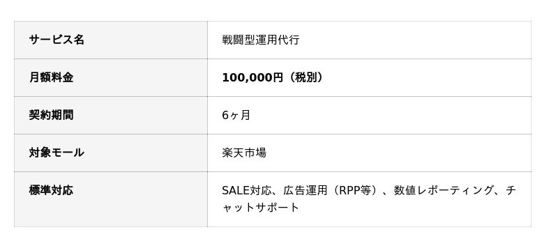 本サービスは、戦略立案よりも「実行」に重点を置き、SALE対応・広告運用(RPP等)など売上に直結するオフェンス施策を月額100,000円(税別)・6ヶ月契約でサポートするプランです。