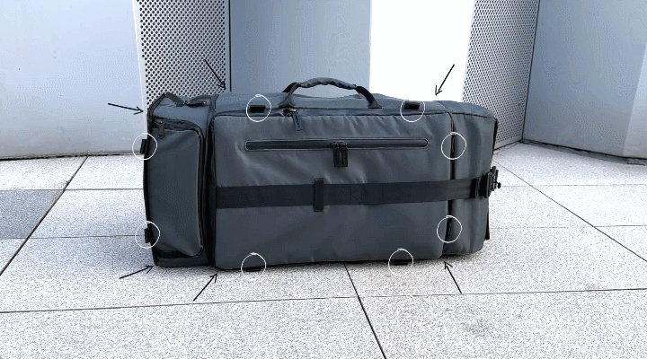 バッグの内外にストラップの取り付けができる14個のループを設置。付属の2本のストラップを使うことでバッグとしての利便性がさらに向上。バッグの外も“収納スペース”にできる設計。