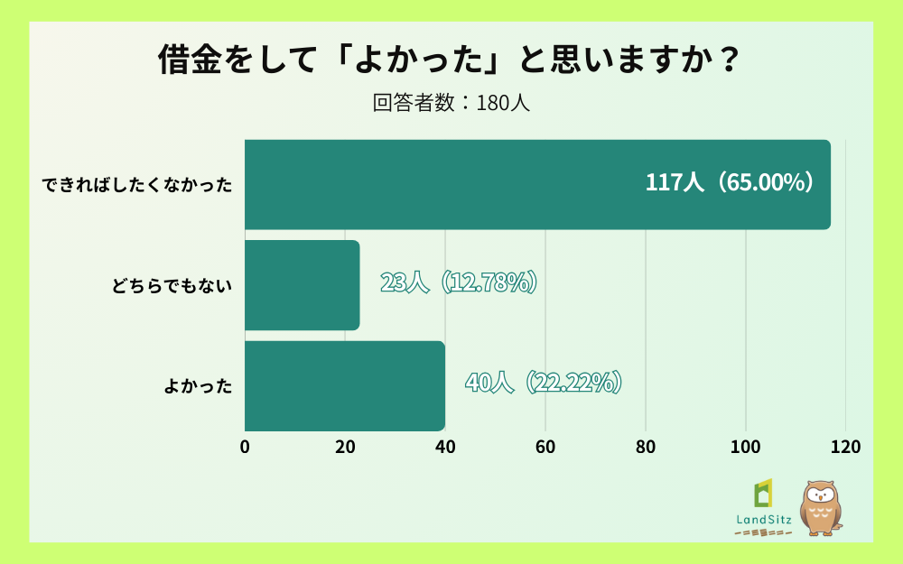 「借金をして『よかった』と思いますか?」という質問に対し、「できればしたくなかった」が117名(65.0%)と過半数を占めました。