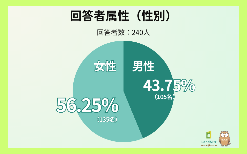 今回の調査では、女性が56.25%(135名)、男性が43.75%(105名)という構成となりました。