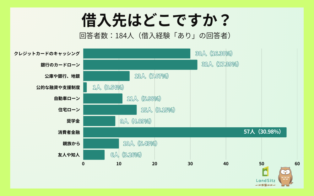 「借入先はどこですか?」という質問では、「消費者金融」が57名(30.98%)で最多となりました。次いで「銀行のカードローン」が32名(17.39%)、「クレジットカードのキャッシング」が30名(16.30%)と続きました。