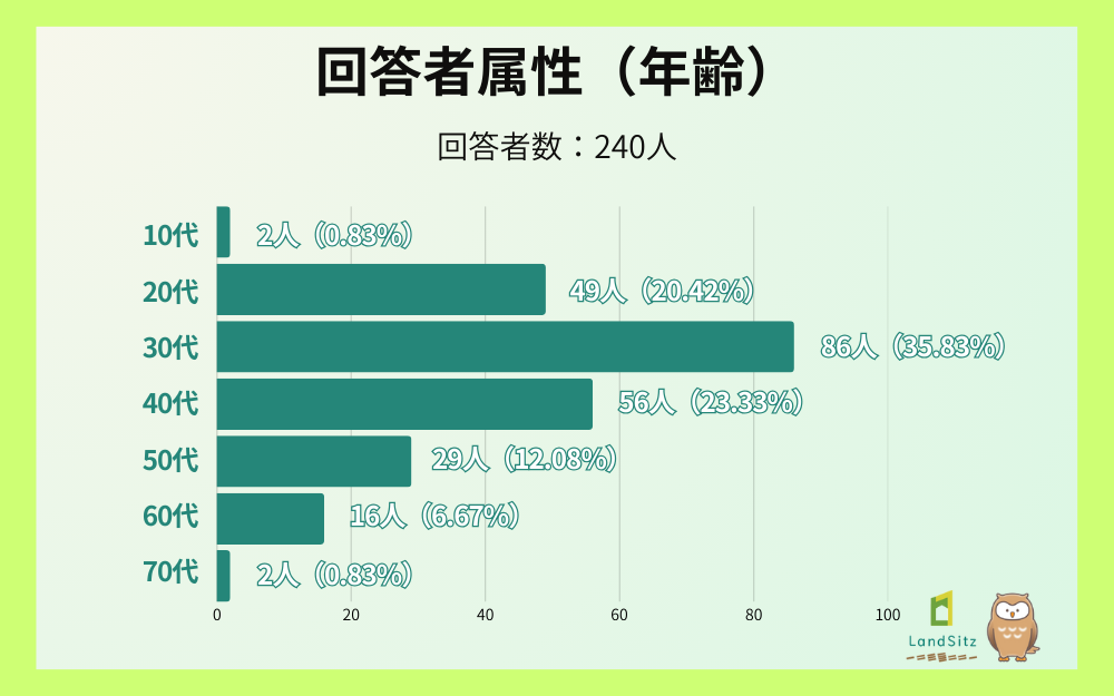 年代別では、30代が最多で35.8%(86名)、次いで40代が23.3%(56名)、20代が20.4%(49名)と続き、働き盛り世代からの回答が全体の約8割を占める結果となりました。