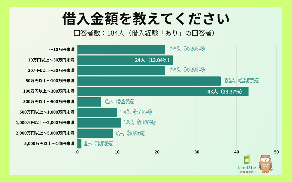 「借入金額を教えてください」という質問では、「100万円以上300万円未満」が43名(23.37%)で最多となりました。次いで「50万円以上100万円未満」が36名(19.57%)、「10万円以上~30万円未満」が24名(13.04%)と続きました。